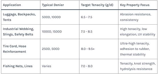 - Tenacity (g/d or cN/dtex): The core specification. 6.0-7.0 g/d is standard for luggage; 7.0-8.0 g/d for premium webbing; 8.0-9.5+ g/d for tire cord & high-performance composites.